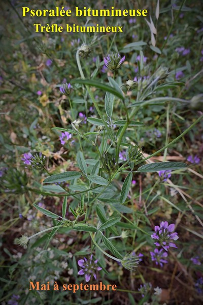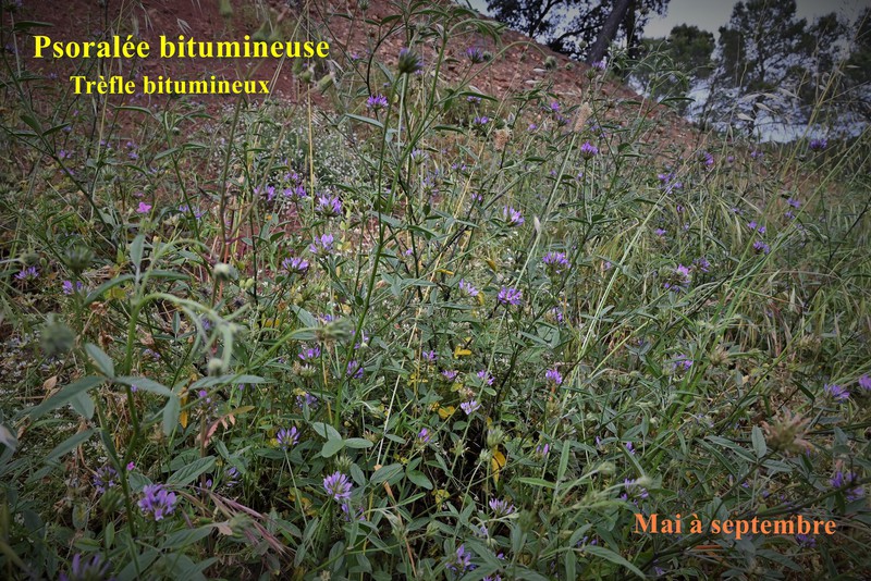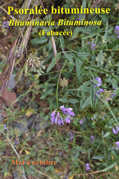 - La Psoralée bitumineuse ou Trèfle bitumineux (Bituminaria Bituminosa), en floraison de mai à octobre :