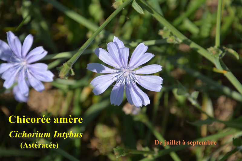 De la famille des Astéracées, la chicorée amère, est l'une des rares plantes qui persistent à fleurir sur les bords des chemins et des routes à partir de juillet jusqu'à septembre, alors que tout est grillé par le soleil ou... débroussaillé par la civilisation! Ses superbes inflorescences, d'un bleu céruléen sont visibles le matin, elles se ferment sous le soleil de l'après-midi.