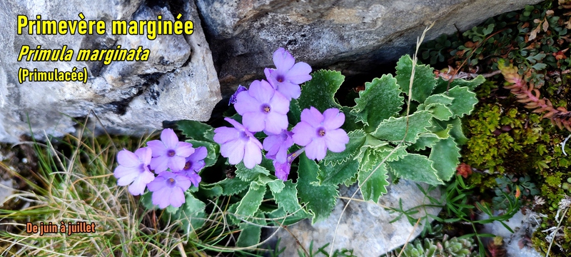 Cette Primula pousse en altitude dans les failles rocheuses de juin à juillet. Ses feuilles bleuâtres et dentées la font reconnaître à coup sûr !
