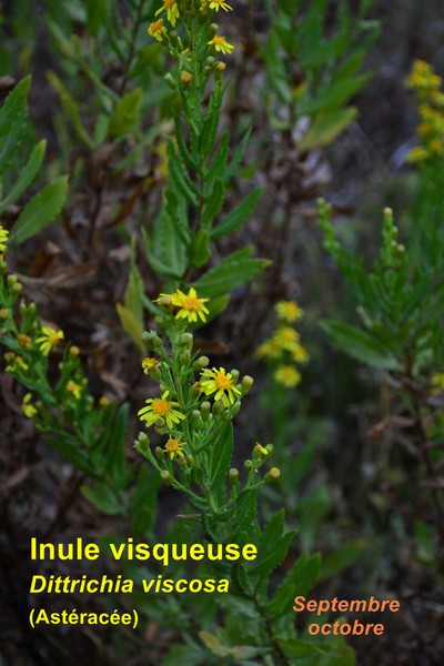 - L'Inule visqueuse (Dittrichia viscosa), en floraison de septembre à octobre :