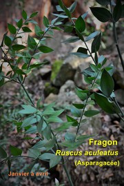 Le Fragon, aussi appelé Faux Houx (feuilles coriaces et piquantes), fleurit dès janvier. Ses fleurs, petites, verdâtres, sont joliment disposées sur chaque feuille, comme des bijoux sur un