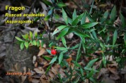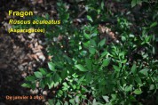 Le Fragon, aussi appelé Faux Houx (feuilles coriaces et piquantes), fleurit dès janvier. Ses fleurs, petites, verdâtres, sont joliment disposées sur chaque feuille, comme des bijoux sur un